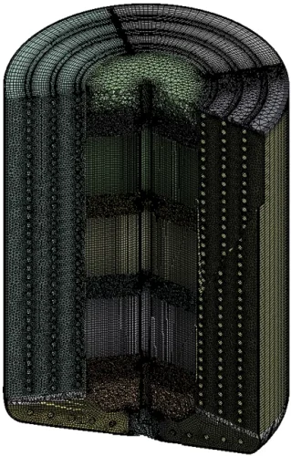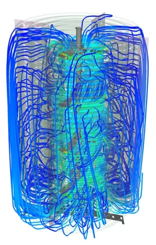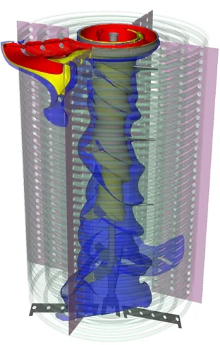 SIMTEC created a CFD model of the KRONOSPAN new batch reactor to predict its performance. The geometry included the rotating impeller, the baffles and the heat-exchange spiral pipes. For this case, the intense generation of heat could result to the solidification of the materials, effectively destroying the reactor contents or even the reactor itself.