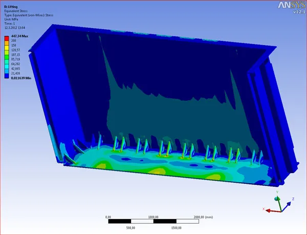 The analyses enable us to tackle not only the issues of the structure reliability and integrity during its lifecycle but also the optimisation of a structure in order to design it better in terms of material usage with regard to the production costs and its electrical performance. An example of structural analysis of the tank during filling with oil is represented in Images 1 and 2. Image 1 presents the deformation of the tank and image 2 the equivalent stresses. The equivalent stress during the transformer lift is presented in image 3.